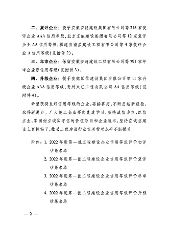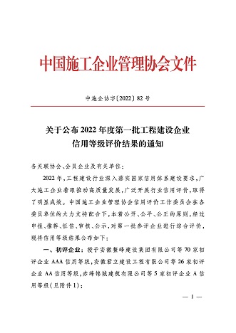 2022年,3044永利集团再次荣获施工企业最高信用评级“AAA级企业信用证书”。这是对3044永利集团持续积累的经营管理能力、合同履约能力、市场竞争能力及优质社会形象的权威认证。
