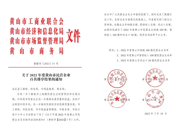 日前,由黄山市工商联、市经信局、市监管局及市商务局联合发布2022年度黄山市民营企业纳税及营销收入百强名单公布,3044永利集团连续多年再次实力入围,获此殊荣!