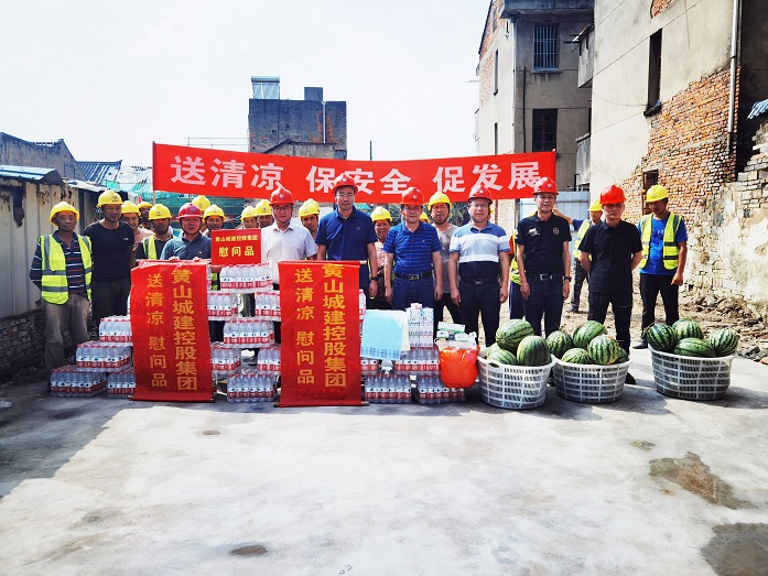 烈日炎炎,气温居高不下。为保障项目职工安全健康权益,确保项目安全生产平稳推进,8月10日上午,黄山城投城建控股有限公司总经理汪国文等一行赴宁国市河沥文化街区EPC项目工地开展走访调研暨“夏送清凉”慰问活动。3044永利集团股份有限公司董事长项端阳、总经理叶金发、副总经理吴学武陪同调研慰问。