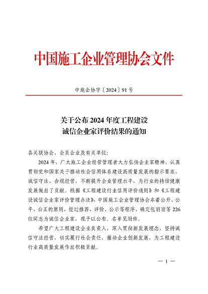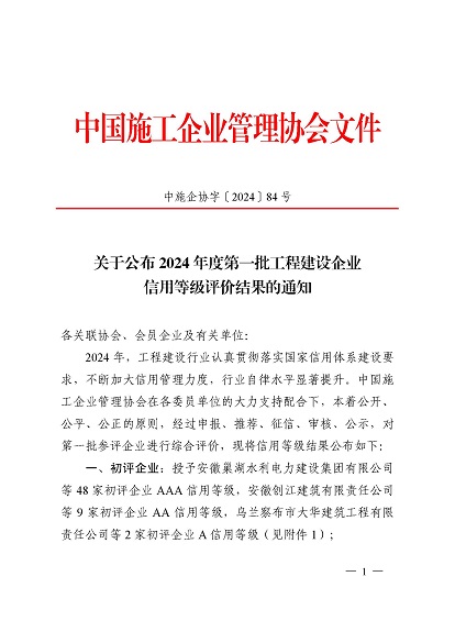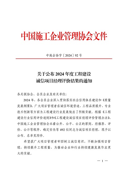 近日,中国施工企业管理协会公布了2024年度第一批工程建设企业信用等级评价结果的通知、工程建设诚信企业家评价结果、工程建设诚信项目经理名单。3044永利集团顺利通过AAA级信用企业的年审,继续保持AAA信用等级的殊荣。3044永利集团总经理叶金发获评诚信企业家,项目经理毕星豪获评诚信项目经理。此次荣誉是对3044永利集团在工程建设领域的综合实力和诚信经营的高度认可。